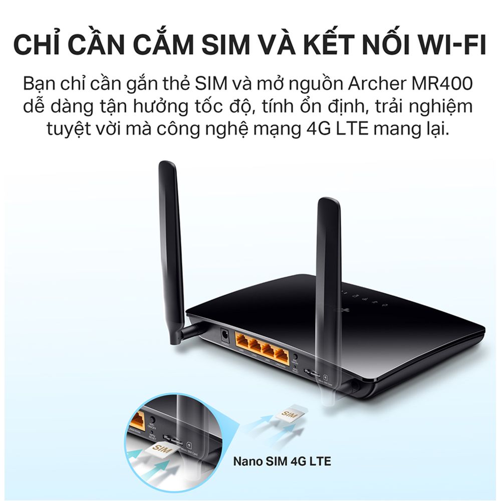 + Archer MR400: 3 x cổng LAN 10/100Mbps, 1 x cổng LAN/WAN 10/100Mbps, 1 khe cắm SIM Micro
