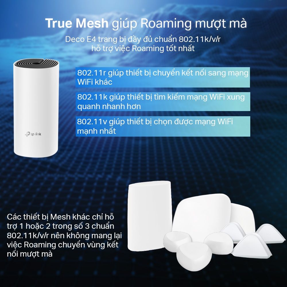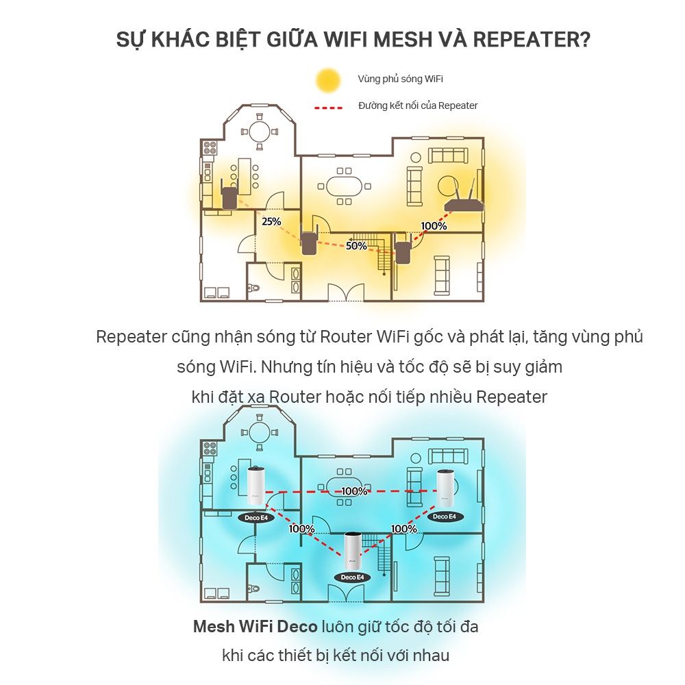 - Deco E4/M4 với chuẩn WiFi AC băng tần kép tốc độ 1200Mbps, cổng WAN/LAN Deco E4 là 100Mbps, M4 là 1000Mbps